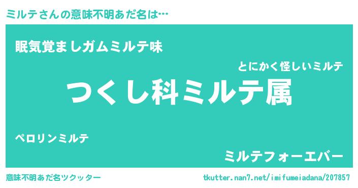| 男性向けラノベタイトル風あだ名 | 『ミルテ~年齢イコール彼女いない歴の魔法使い~』 |