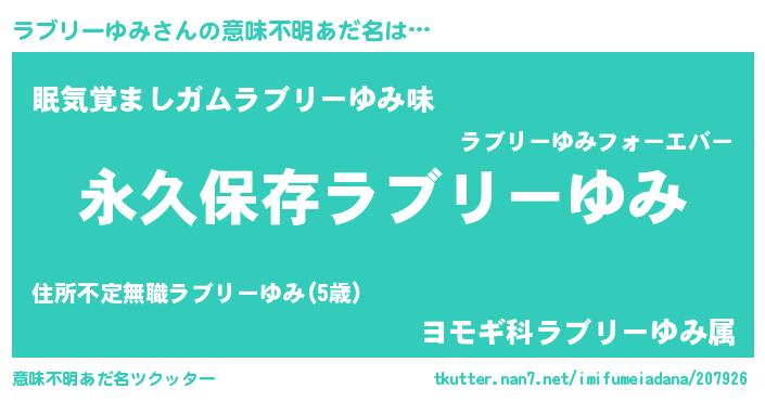 | 男性向けラノベタイトル風あだ名 | 『うちのラブリーゆみが世界を掌握している!』 |