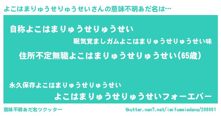 | 料理風あだ名 | 『よこはまりゅうせりゅうせいのカルパッチョ風』 |