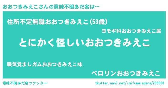 | 胡散臭い通販商品みたいなあだ名 | 『信頼と実績のサプリメント…その名も「おおつきみえこ」』 |