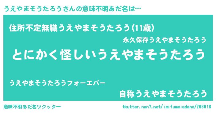 | 男性向けラノベタイトル風あだ名 | 『うちのうえやまそうたろうが世界を掌握している!』 |