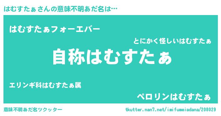 | 男性向けラノベタイトル風あだ名 | 『Re:はむすたぁから始める異世界生活』 |