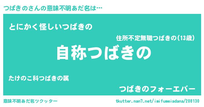 | 男性向けラノベタイトル風あだ名 | 『Re:つばきのから始める異世界生活』 |