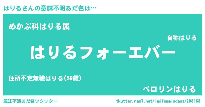 | 男性向けラノベタイトル風あだ名 | 『うちのはりるが世界を掌握している!』 |
