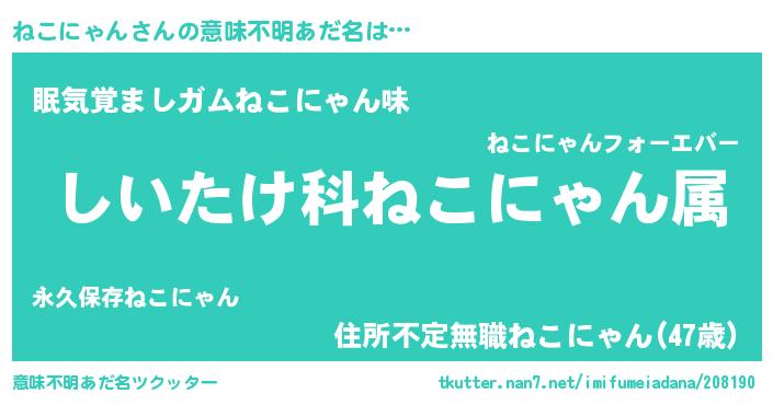 | 男性向けラノベタイトル風あだ名 | 『ネコニャンスレイヤー』 |