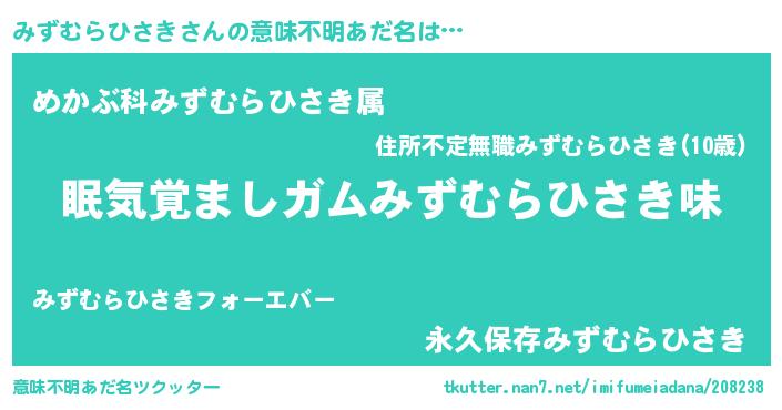 | ヘコむあだ名 | 『みずむらひさき(小並感)』『酢こんぶ』 |