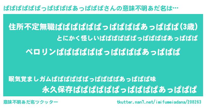 | 男性向けラノベタイトル風あだ名 | 『ぱぱぱぱぱぱっぱぱぱぱあっぱぱぱの憂鬱』 |