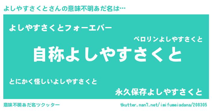 | 胡散臭い通販商品みたいなあだ名 | 『ガンによく効く高麗人参…その名も「よしやすさくと」』 |