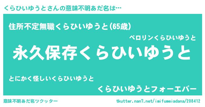 | 胡散臭い通販商品みたいなあだ名 | 『来世でも幸せになれる水素水…その名も「くらひいゆうと」』 |