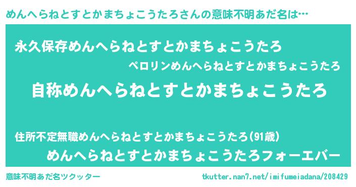 | ヘコむあだ名 | 『めんへらねとすとかまちょこうたろ(遠い目)』 |