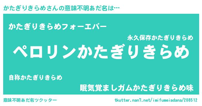 | 男性向けラノベタイトル風あだ名 | 『うちのかたぎりきらめが世界を掌握している!』 |