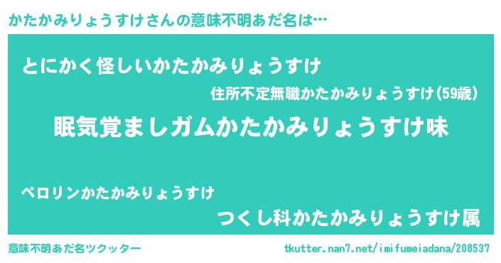 | 男性向けラノベタイトル風あだ名 | 『おまえをオタクにしてやるから、俺をかたかみりょうすけにしてくれ! 』 |