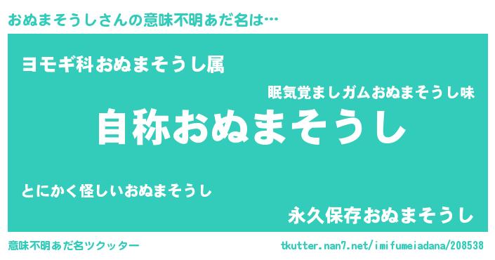 | 男性向けラノベタイトル風あだ名 | 『Re:おぬまそうしから始める異世界生活』 |