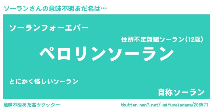 | 男性向けラノベタイトル風あだ名 | 『ソーランの憂鬱』『魔弾の王とソーラン』 |