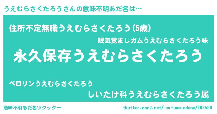 | 男性向けラノベタイトル風あだ名 | 『うえむらさくたろうという概念が存在しない退屈な世界 』 |