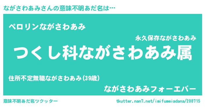 | 男性向けラノベタイトル風あだ名 | 『ながさわあみ~年齢イコール彼女いない歴の魔法使い~』 |