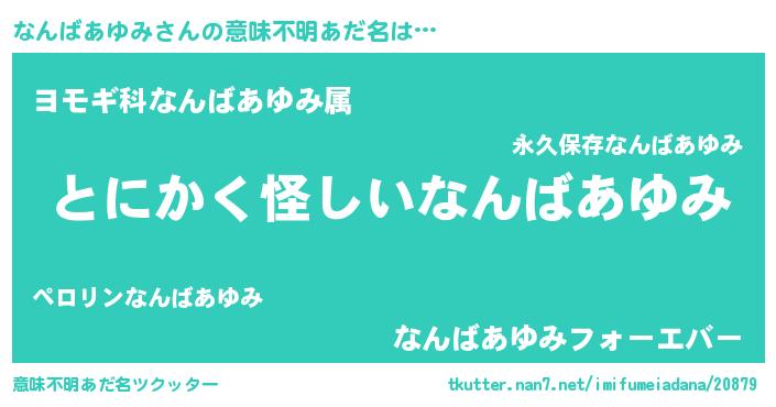 | 男性向けラノベタイトル風あだ名 | 『なんばあゆみの嫁は女の子じゃないと思った?』 |