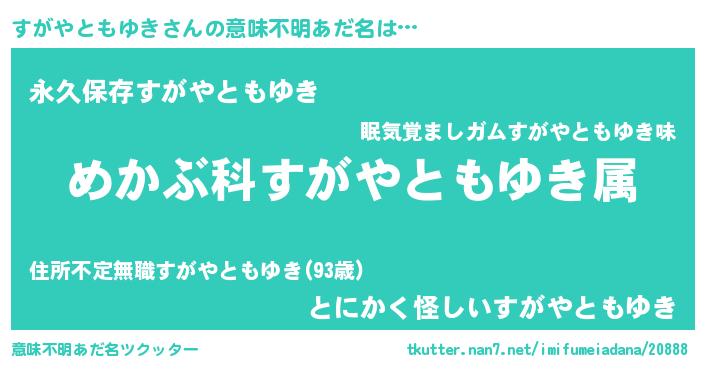 | 胡散臭い通販商品みたいなあだ名 | 『絶対に幸福をもたらす水素水…その名も「すがやともゆき」』 |