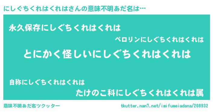 | 欧米人風あだ名 | 『ウサインにしぐちくれはくれは』 |