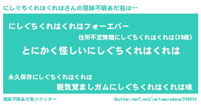| 欧米人風あだ名 | 『ウサインにしぐちくれはくれは』 |