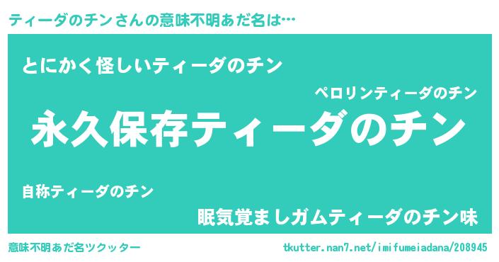 | 男性向けラノベタイトル風あだ名 | 『ティーダのチンという概念が存在しない退屈な世界 』 |