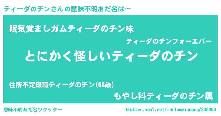 | 女子向けラノベタイトル風あだ名 | 『ティーダのチンの卵を拾いまして』 |