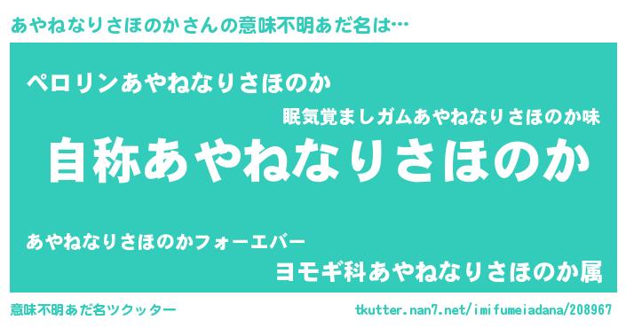 | 男性向けラノベタイトル風あだ名 | 『Re:あやねなりさほのかから始める異世界生活』 |