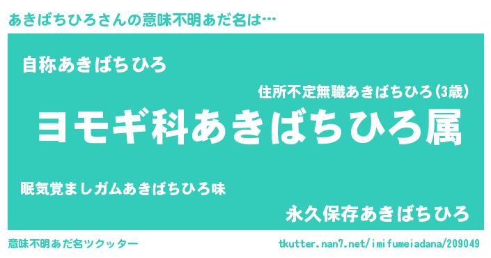 | ヘコむあだ名 | 『あきばちひろ(爆)』『あきにー』 |