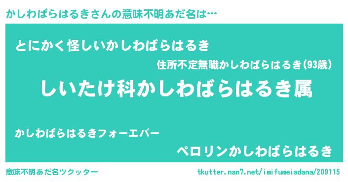 | 胡散臭い通販商品みたいなあだ名 | 『信頼と実績のペンダント…その名も「かしわばらはるき」』 |