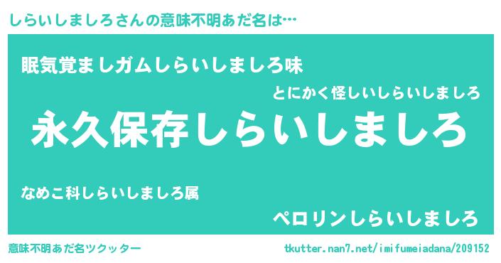 | 胡散臭い通販商品みたいなあだ名 | 『絶対に幸福をもたらす健康食品…その名も「しらいしましろ」』 |