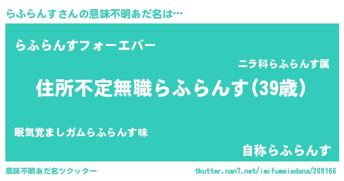 | ヒーロー風カッコイイあだ名 | 『仮面ラフダー』『慈愛の使者らふらんす』 |