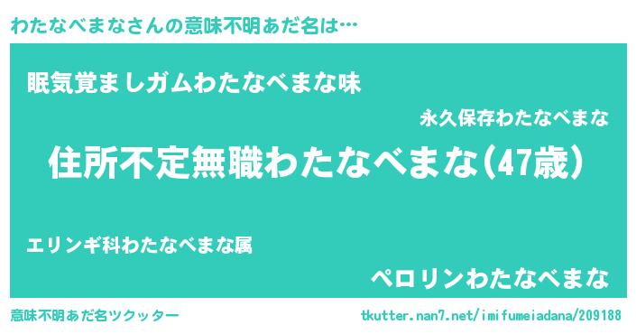 | 男性向けラノベタイトル風あだ名 | 『わたなべまなに滅ぼされるだけの簡単なお仕事です』 |