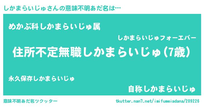 | 男性向けラノベタイトル風あだ名 | 『この素晴らしい世界にしかまらいじゅを!』 |