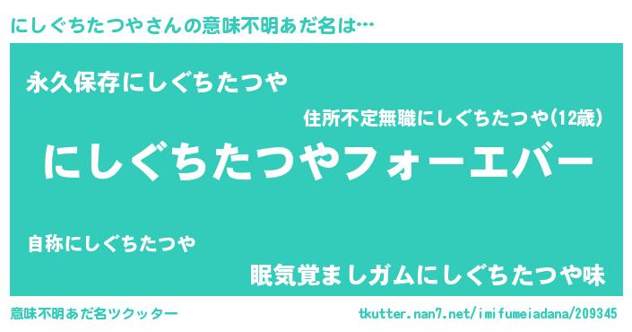 | 男性向けラノベタイトル風あだ名 | 『冴えないにしぐちたつやの育てかた』 |