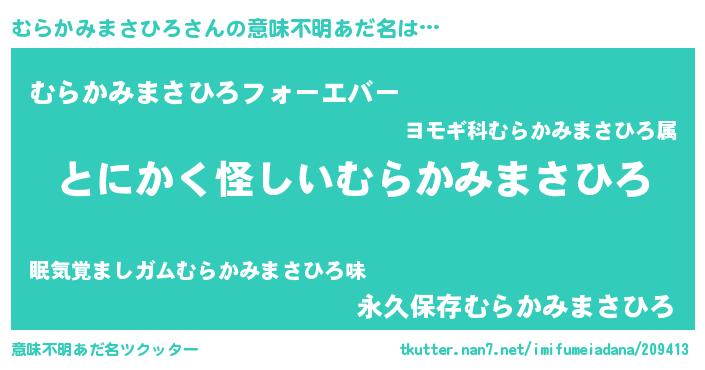 | 女子向けラノベタイトル風あだ名 | 『むらかみまさひろの卵を拾いまして』 |