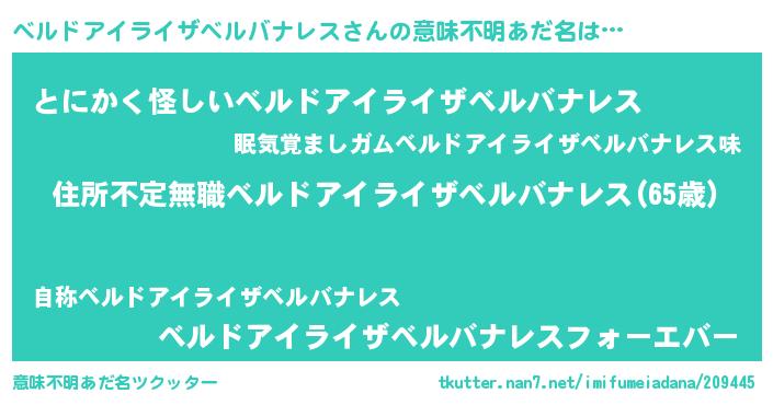 | 女子向けラノベタイトル風あだ名 | 『悪役ベルドアイライザベルバナレスに転生したようですが、知った事ではありません』 |