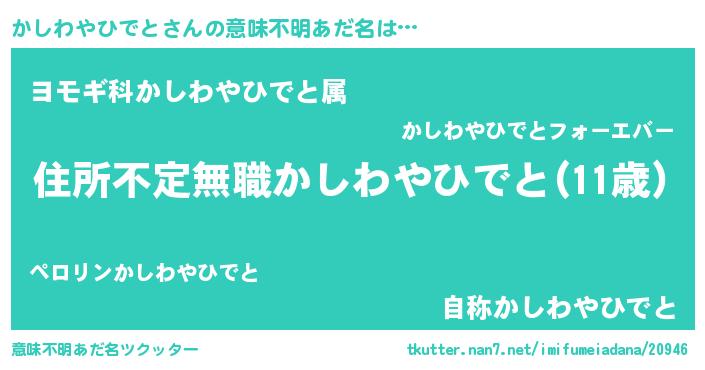 | 男性向けラノベタイトル風あだ名 | 『この素晴らしい世界にかしわやひでとを!』 |