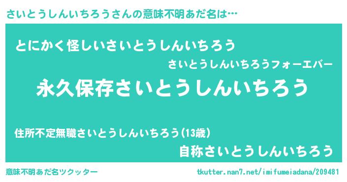 | 男性向けラノベタイトル風あだ名 | 『うちのさいとうしんいちろうが世界を掌握している!』 |