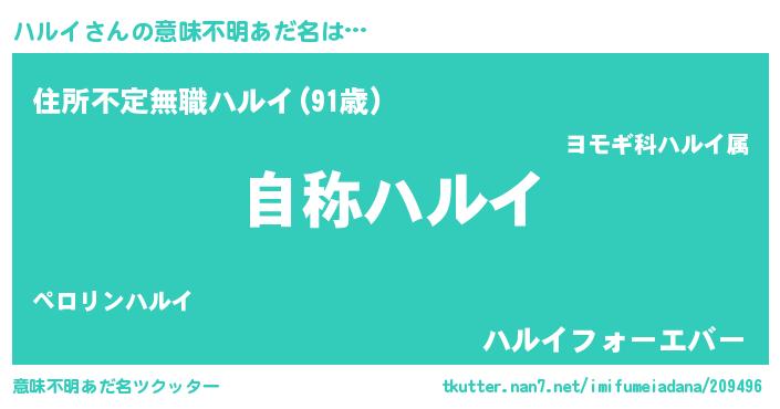 | 男性向けラノベタイトル風あだ名 | 『Re:ハルイから始める異世界生活』 |