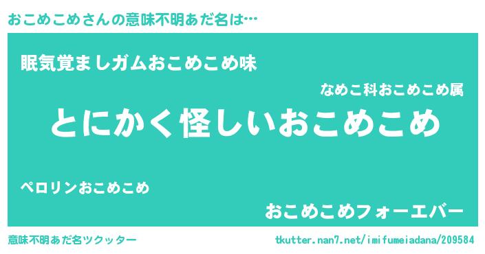 | 男性向けラノベタイトル風あだ名 | 『おこめこめの嫁は女の子じゃないと思った?』 |