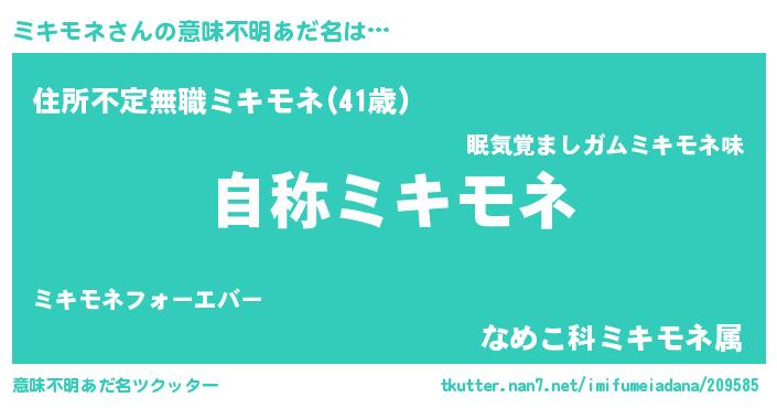 | 男性向けラノベタイトル風あだ名 | 『Re:ミキモネから始める異世界生活』 |
