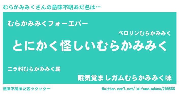 | 男性向けラノベタイトル風あだ名 | 『むらかみみくの嫁は女の子じゃないと思った?』 |