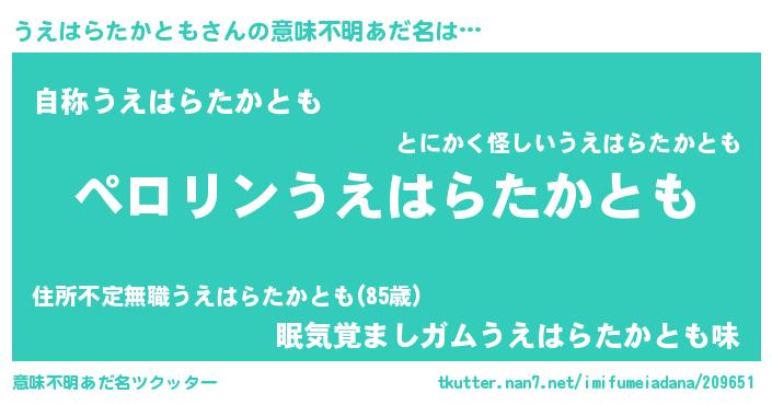 | 胡散臭い通販商品みたいなあだ名 | 『必ず成功するブレスレット…その名も「うえはらたかとも」』 |