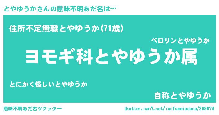 | 女子向けラノベタイトル風あだ名 | 『とやゆうかの玉の輿計画!』 |