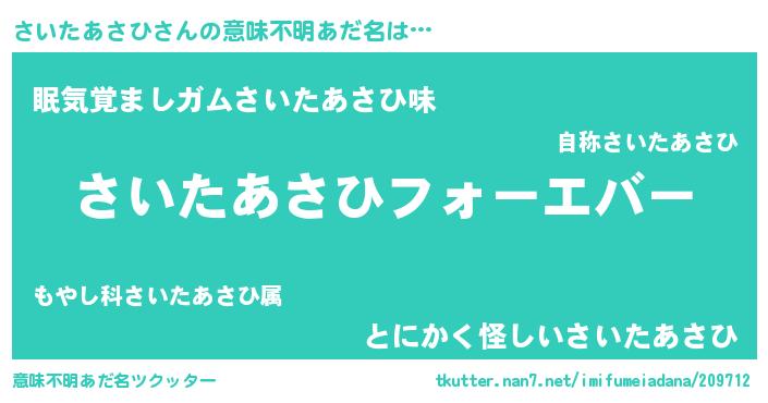 | 男性向けラノベタイトル風あだ名 | 『さいたあさひに滅ぼされるだけの簡単なお仕事です』 |