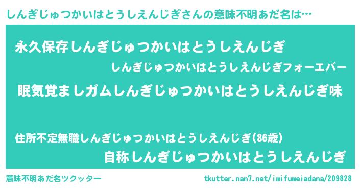 | 女子向けラノベタイトル風あだ名 | 『しんぎじゅつかいはとうしえんじぎ夫妻のなれそめ』 |