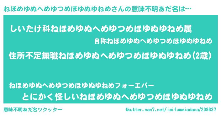 | 欧米人風あだ名 | 『ダレノガレねほめゆぬへめゆつめほゆぬゆねめ』 |