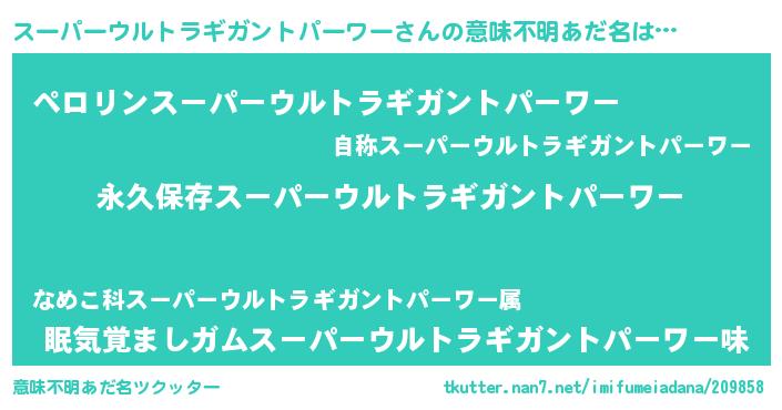 | 男性向けラノベタイトル風あだ名 | 『スーパーウルトラギガントパーワーという概念が存在しない退屈な世界 』 |