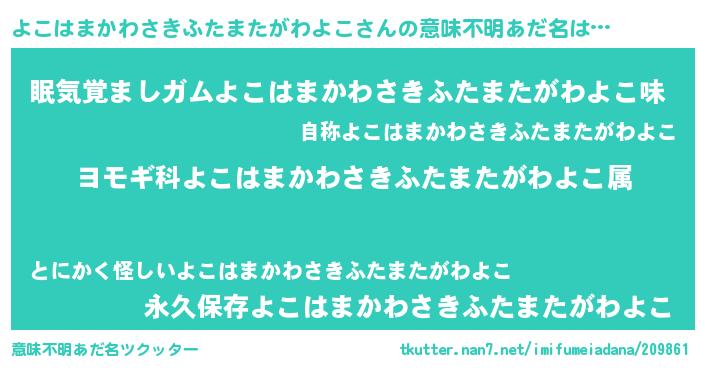 | 伝説のあだ名 | 『救世主となる占い師よこはまかわさきふたまたがわよこ』 |