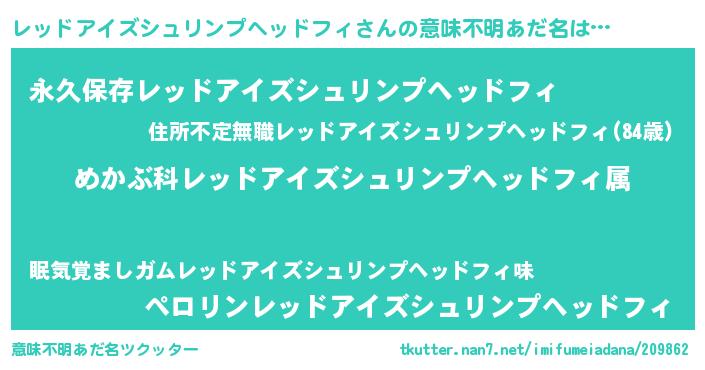 | 胡散臭い通販商品みたいなあだ名 | 『絶対に幸福をもたらす水素水…その名も「レッドアイズシュリンプヘッドフィ」』 |
